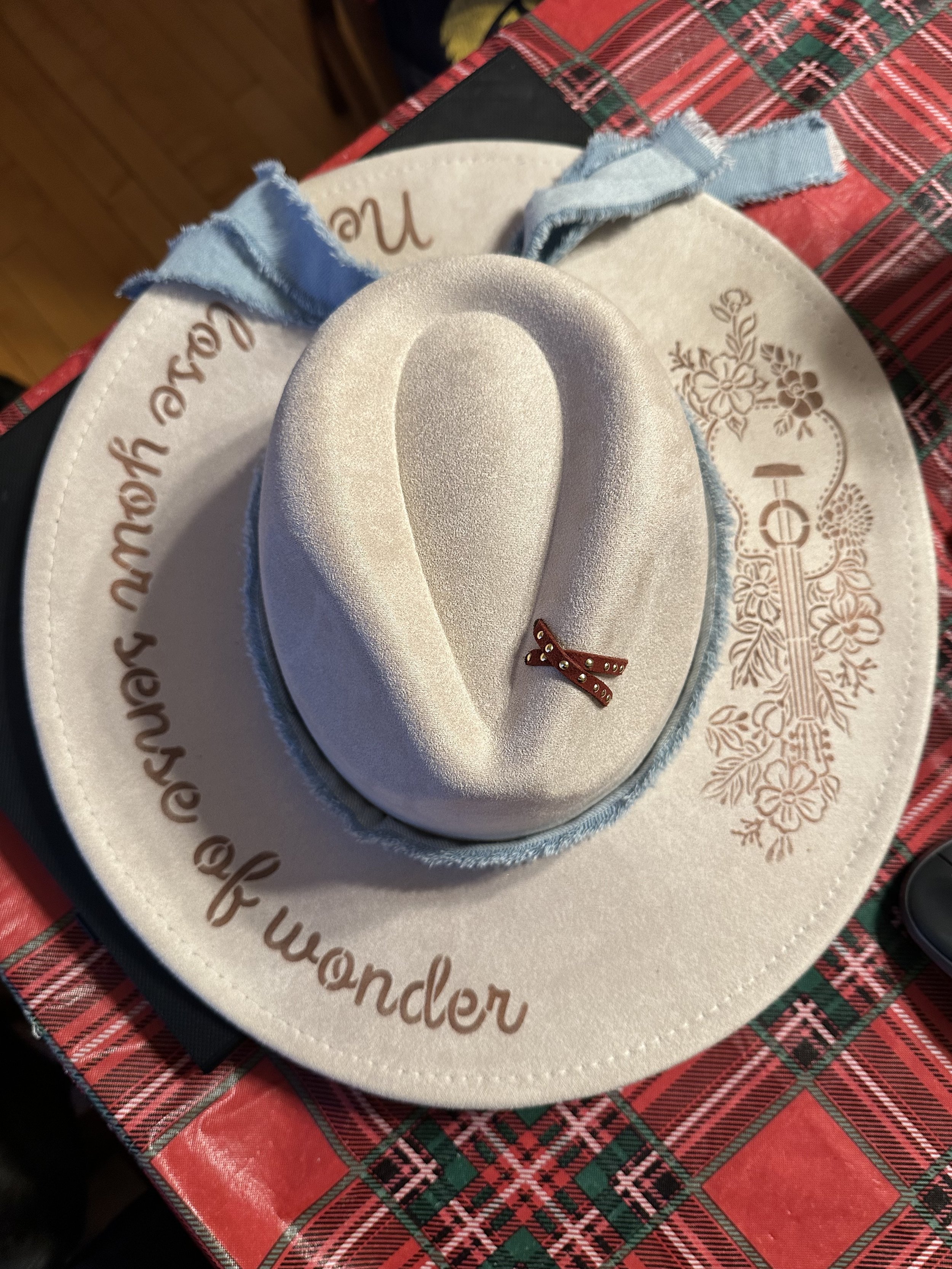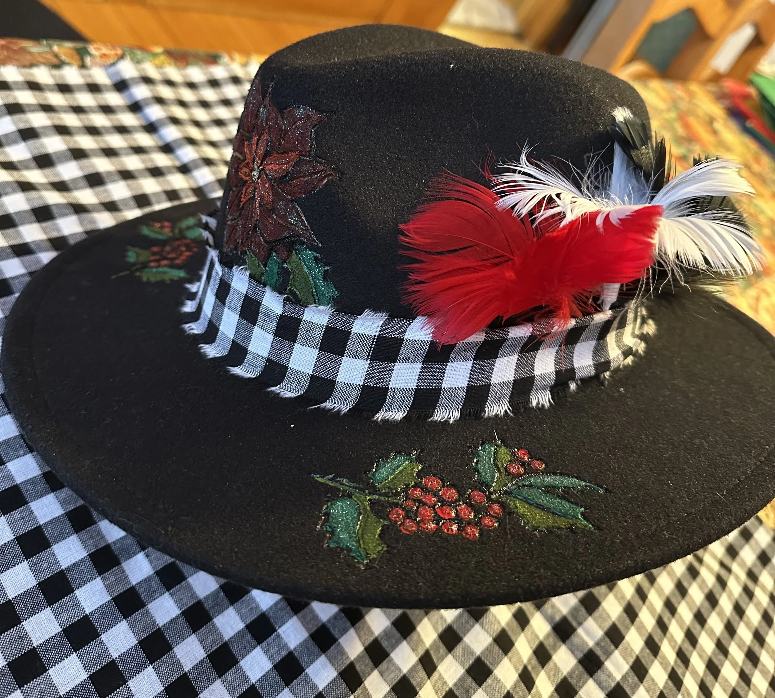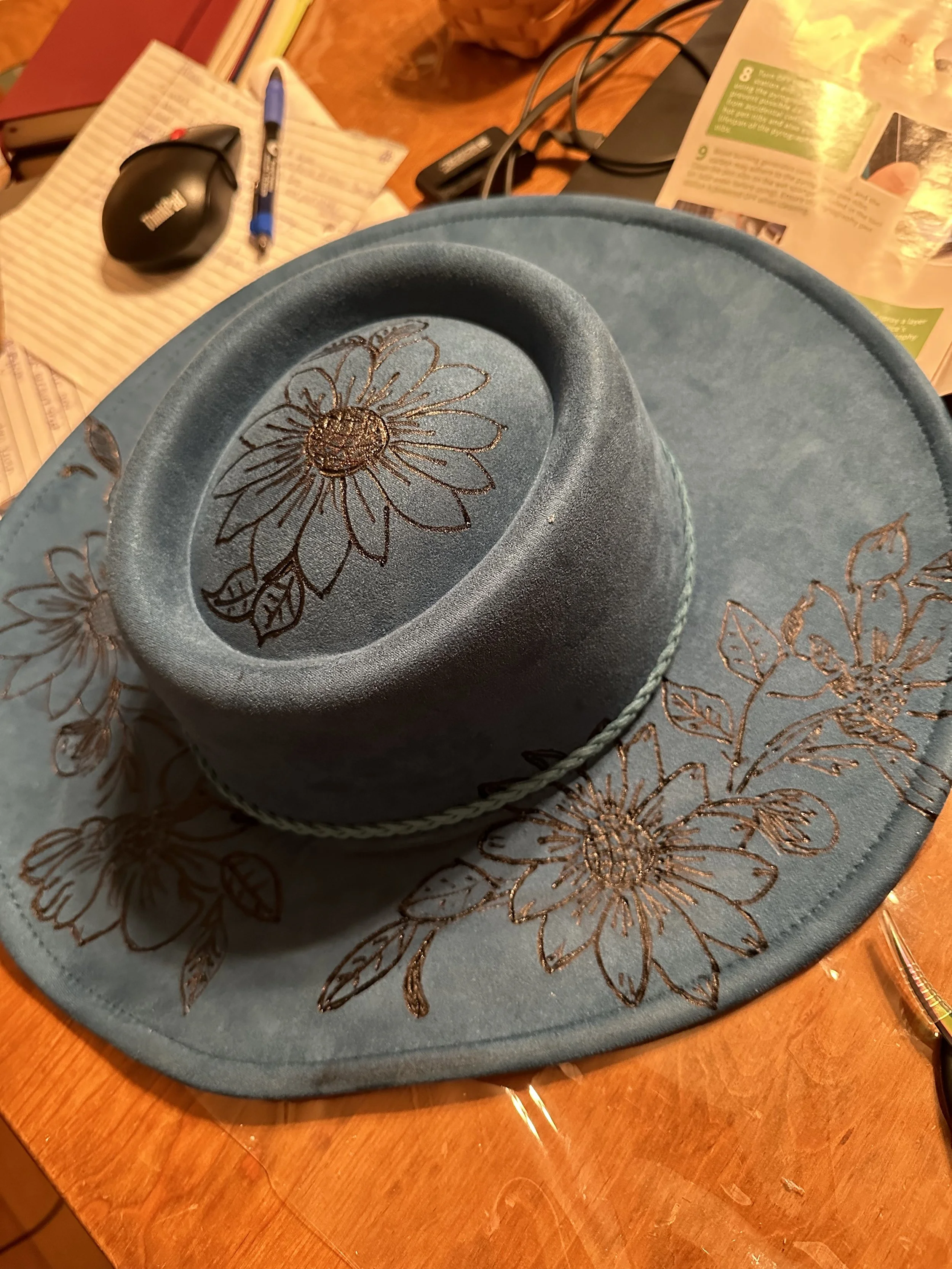 Mandala Art has to do with the energy within as you create. The basic pattern starts with a center dot and you work outward from there. Stop in while I’m working as I love to talk about my art and explaining the process. You will also find a new art form on my wall and that is hat burning/painting, wearable art as I call it.